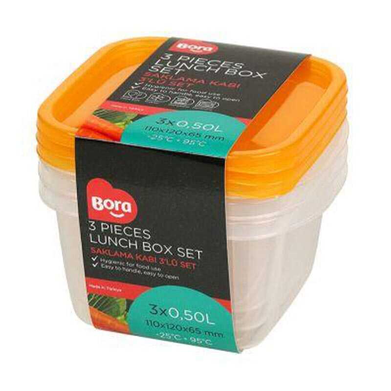 Bora Plastik 3'lü Kare Saklama Kabı, 500 ml, Şeffaf Gövde