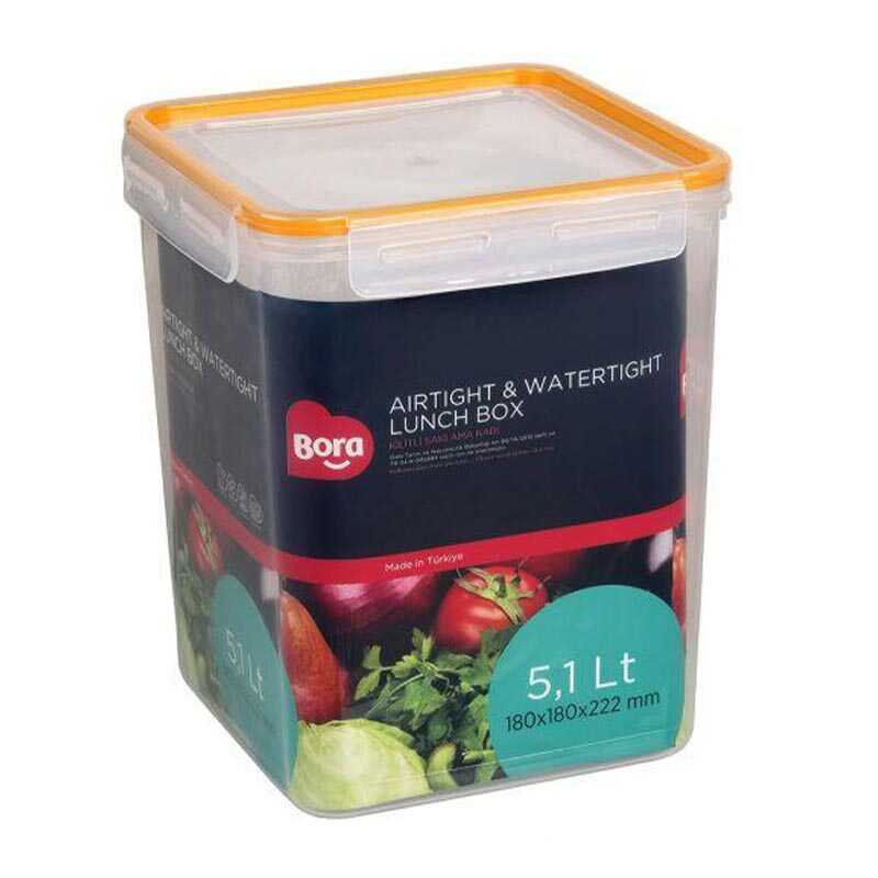 Bora Plastik Kilitli Saklama Kabı, 5.1 Lt hacmi ile gıda ve malzemeleri güvenli ve düzenli şekilde saklamanızı sağlar. Kare tasarımı ve şeffaf gövdesi sayesinde içeriği kolayca görebilir, kullanım kolaylığı sunar.