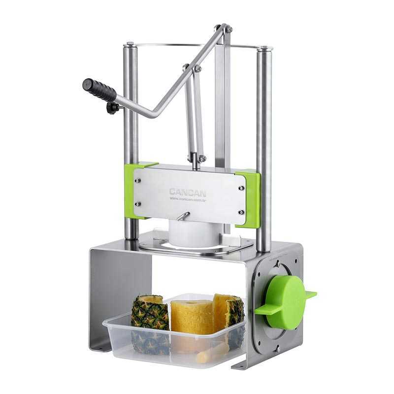 Cancan 0801 Profesyonel Ananas Soyma Makinesi, otel, restoran, alışveriş merkezleri ve manav reyonları gibi yerlerde ananas meyvelerini tek hamlede kabuk ve çekirdeklerinden ayırmak için tasarlanmıştır. Polietilen kızaklar sayesinde ananas takılmadan kesilir, paslanmaz bıçaklar ile fire vermeden dilimleme sağlar. Ürün güvenlik pimleri, itici takoz ve koruyucu bıçak kapakları ile güvenli kullanım sunar.