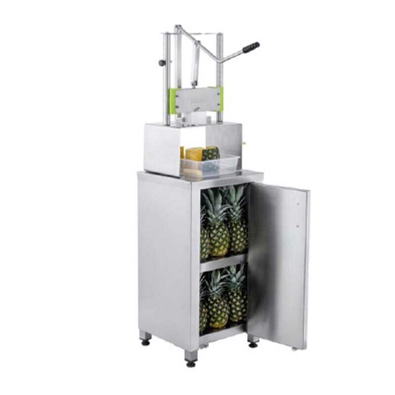 Cancan 1104 Ananas Servis Standı, ananas soyma ve dilimleme işlemlerinin daha düzenli, hijyenik ve ergonomik şekilde yapılabilmesi için tasarlanmış profesyonel bir yardımcı ekipmandır. Sağlam yapısı sayesinde yoğun kullanıma uygun olup, ananas soyma makineleriyle birlikte kullanıldığında çalışma alanında hem hız hem de düzen sağlar.
