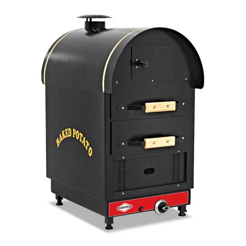 Empero Gazlı Kumpir Fırını, iki çekmeceli tasarımıyla restoranlar ve kafelerde hızlı ve verimli kumpir üretimi sağlar. Her çekmecede ayrı brülör bulunması, eşit ısı dağılımı ve kontrollü pişirme imkanı sunar. Çift izolasyonlu gövdesi ile enerji tasarruflu ve güvenli kullanım sağlar.
