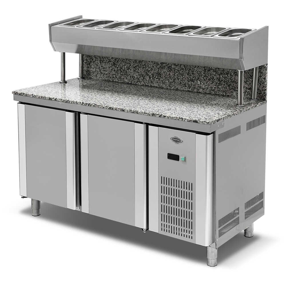 Empero Granitli Pizza ve Salata Hazırlık Buzdolabı, 2 kapılı ve fanlı soğutma sistemi ile yiyecekleri +0 ºC ile +5 ºC arasında güvenli şekilde muhafaza eder. 1500 mm’de 8 adet, 2000 mm’de 11 adet GN küvet kapasitesi ve her kapakta 4 adet 400x600 mm tepsi kapasitesi ile yoğun mutfaklarda yüksek verimlilik sağlar.