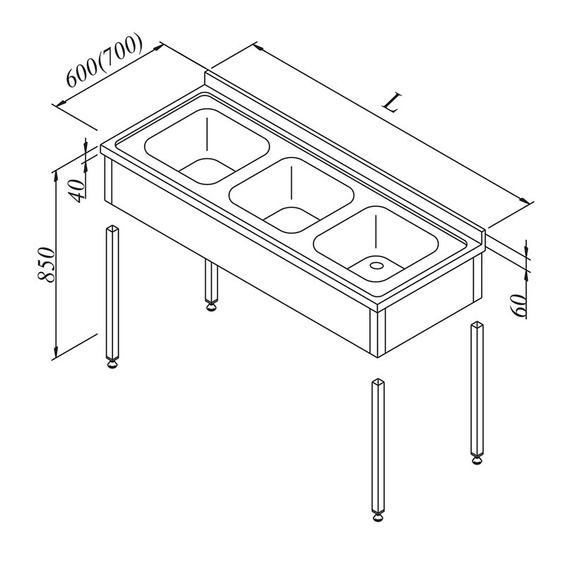 Paslanmaz çelik konstrüksiyona sahip bu 3 gözlü evyeli tezgah, profesyonel mutfaklarda yoğun kullanım için tasarlanmıştır. Pres baskı yöntemiyle üretilmiş 3 adet monoblok evye gözü, dayanıklılığı ve hijyenik kullanımı bir arada sunar.