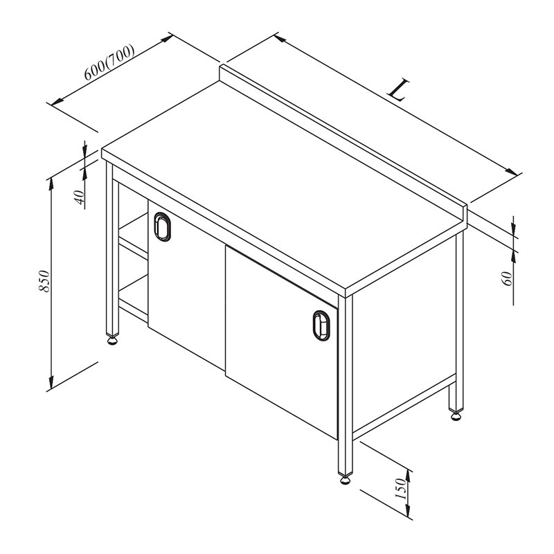 Paslanmaz çelikten üretilmiş bu çalışma tezgahı, dolaplı ve ara raflı yapısıyla mutfakta depolama ve çalışma alanını optimize eder. Üst tabla alınları 40 mm, sırtı 60 mm olup, dayanıklı ve sağlam kullanım sağlar.