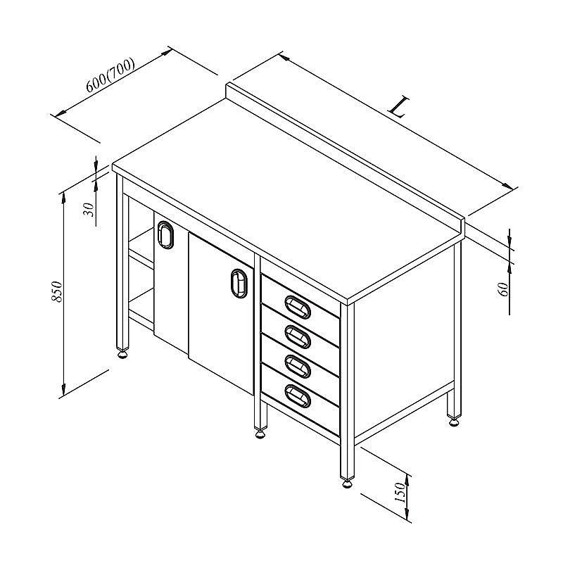Profesyonel mutfaklar için tasarlanan bu çalışma tezgahı, 160x60 cm ölçüsü ile dengeli bir çalışma alanı sunarken entegre dolap, raf ve çekmece yapısıyla maksimum depolama imkanı sağlar. Yoğun mutfak operasyonlarında düzeni ve verimliliği artırmak için geliştirilmiştir.