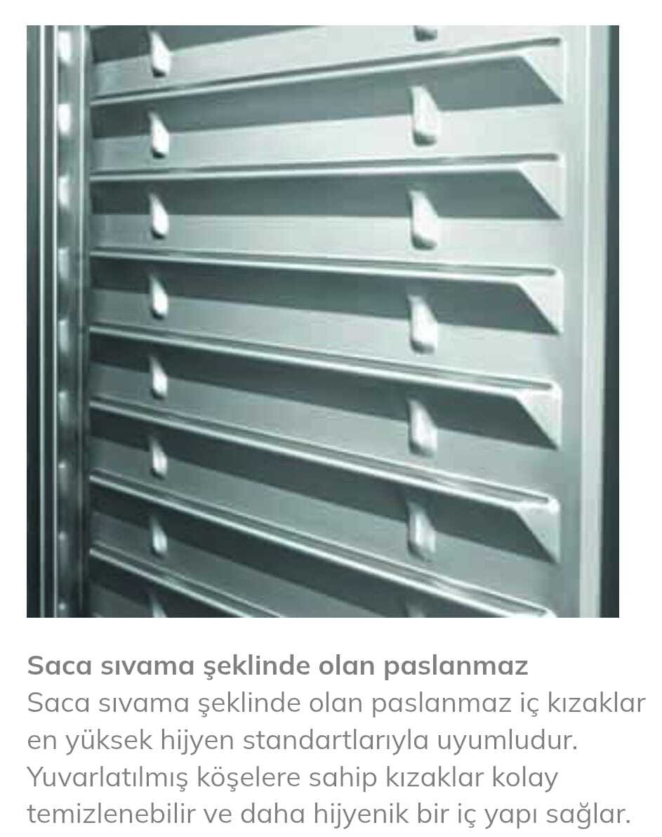 -5 / -22 °C çalışma sıcaklığı aralığı ile ürünlerin güvenli şekilde muhafaza edilmesini sağlar. Özel tasarım hava kanalı ve fan destekli hava sirkülasyonu sayesinde dolap içi optimum hava dağılımı sunar. 80 mm kalınlığında, çevre dostu HFC-Free poliüretan izolasyonlu duvarları düşük enerji tüketimi sağlarken, üçlü yalıtım bölgesi ve manyetik conta sistemi ısı kaybını minimuma indirir.