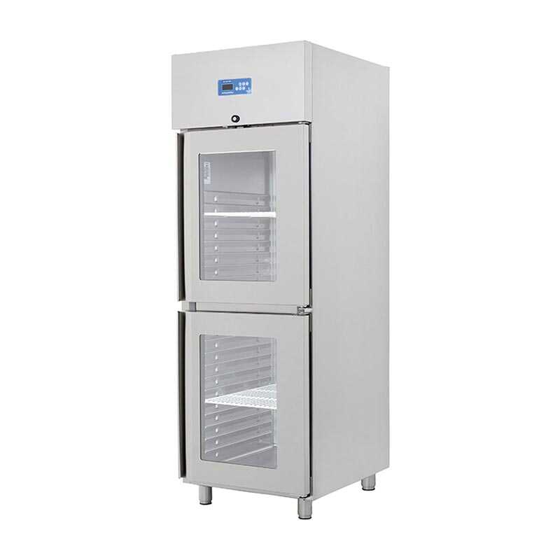 HACCP dijital kontrol paneli sayesinde sıcaklık kontrolü güvenli ve hassas şekilde yapılabilir. Monoblok soğutma sistemi ve fan destekli hava sirkülasyonu dolap içerisinde dengeli soğutma sağlar. 80 mm kalınlığındaki çevre dostu poliüretan izolasyon enerji verimliliğini artırırken, özel tel kondenser sistemi temizlik ihtiyacını azaltır. LED aydınlatma, otomatik fan kesme switchi ve yönü değiştirilebilir kapılar kullanım kolaylığı sunar.