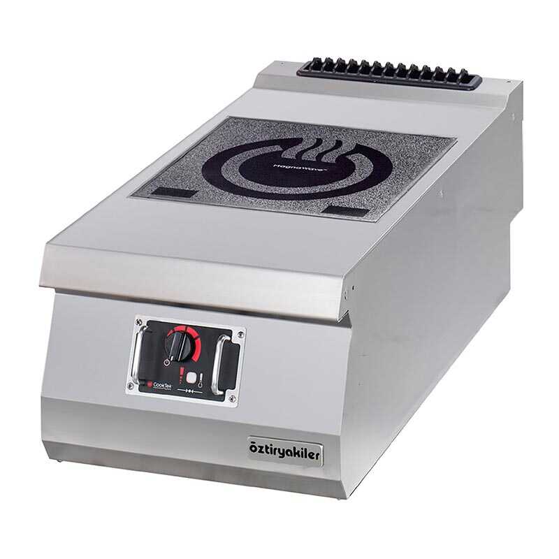 Öztiryakiler setüstü indüksiyon ocak, 40x70 cm ölçülerinde ve paslanmaz çelik gövde ile profesyonel mutfak kullanımı için tasarlanmıştır. Üst tabla pres baskı yöntemi ile üretilmiş 2 mm kalınlığında monoblok yapıya sahiptir ve yuvarlatılmış köşeleri sayesinde temizlik ve dayanıklılık kolaylığı sağlar.