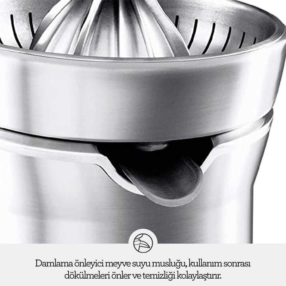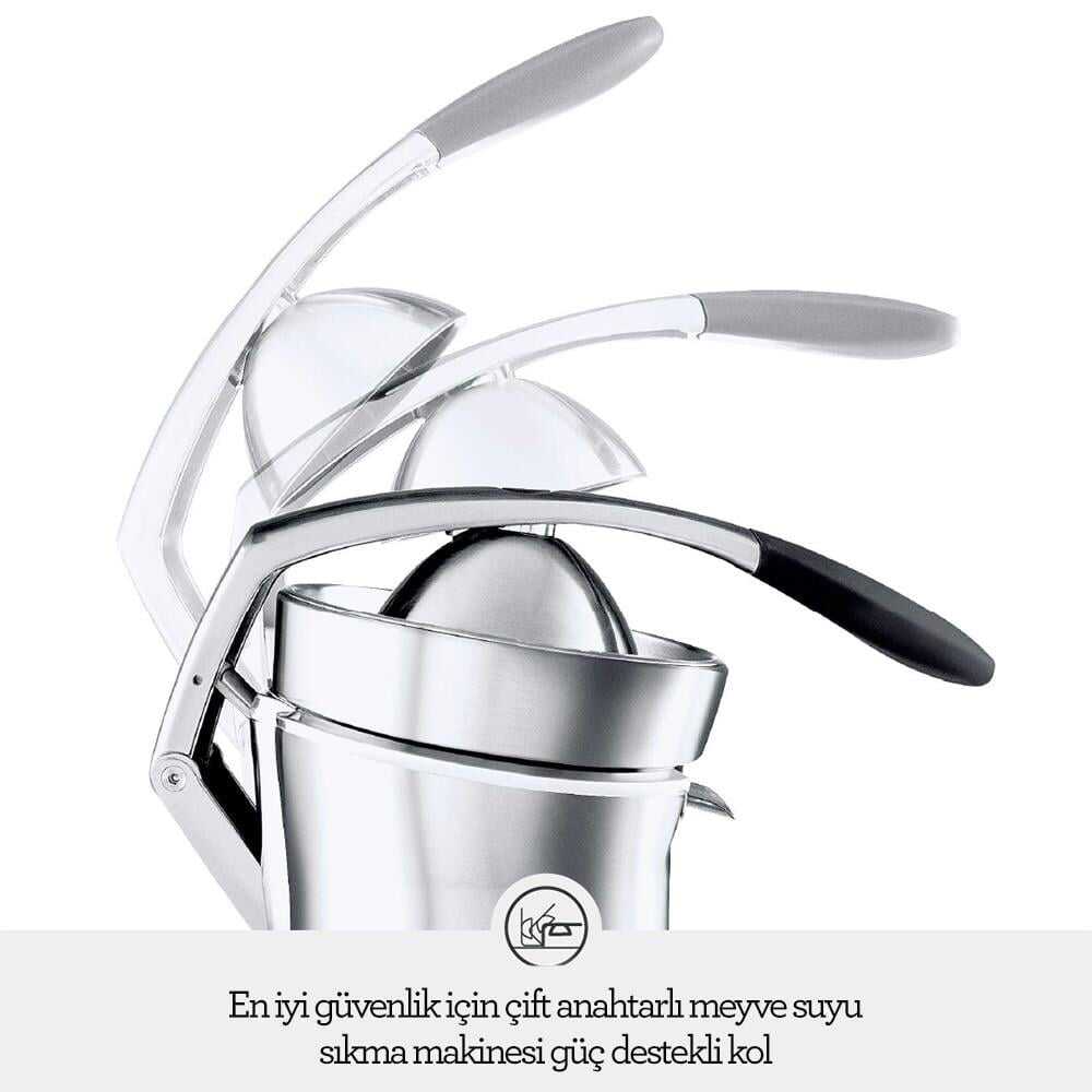 Patentli Quadra-Fin™ koni tasarımı ile meyvelerden en yüksek miktarda suyu çıkarırken, güç destekli kol mekanizması sayesinde zahmetsiz kullanım sunar. Damlama önleyici musluğu ile tezgah temizliğini korurken, paslanmaz çelik yapısı uzun ömürlü kullanım sağlar. Güvenlik sistemi sayesinde yalnızca doğru basınç uygulandığında çalışarak güvenli bir kullanım deneyimi sunar.