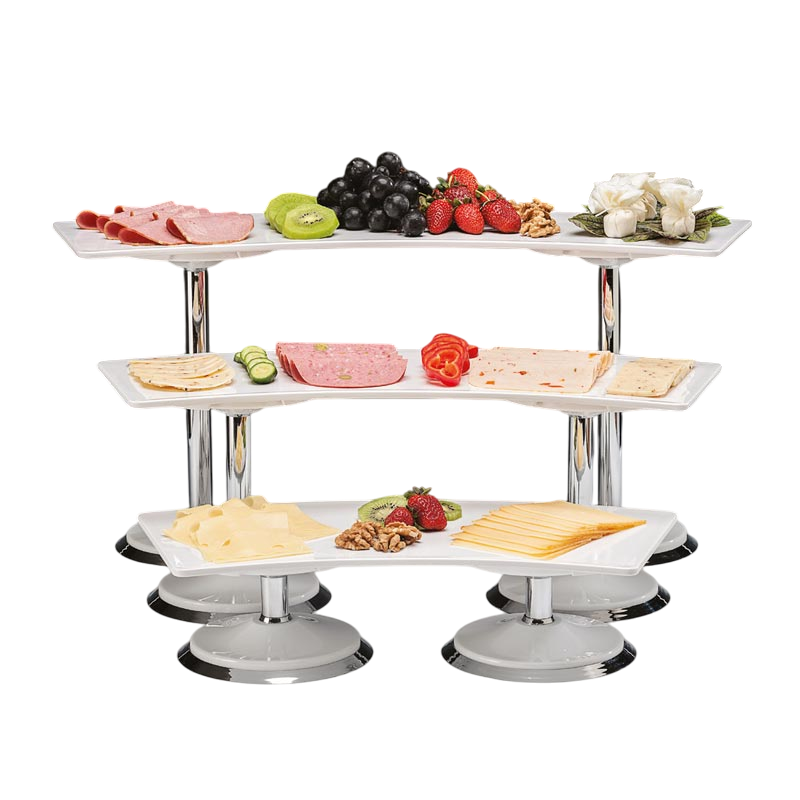 Oteller, restoranlar, kafeler, pastaneler ve açık büfelerde; pasta, tatlı, atıştırmalık ve benzeri ürünlerin düzenli, hijyenik ve profesyonel şekilde sergilenmesi için ideal bir 3 basamaklı melamin teşhir standıdır.