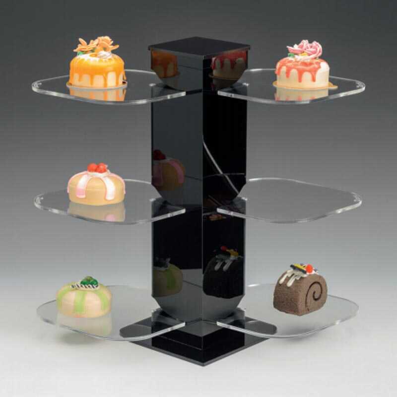 Dayanıklı akrilik malzemeden üretilmiş olan bu teşhir standı, sağlam ve dengeli yapısı ile yoğun kullanıma uygundur. Siyah rengi, sergilenen ürünlerin renk ve dokularını ön plana çıkararak şık bir kontrast oluşturur. Kolay temizlenebilir yüzeyi hijyen standartlarını destekler ve profesyonel sunum alanlarında uzun ömürlü bir çözüm sunar.